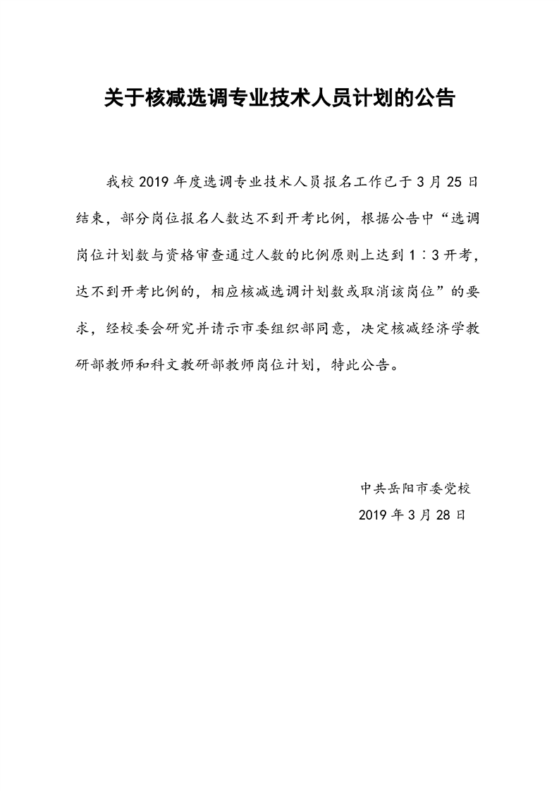 关于核减选调专业技术人员计划的公告