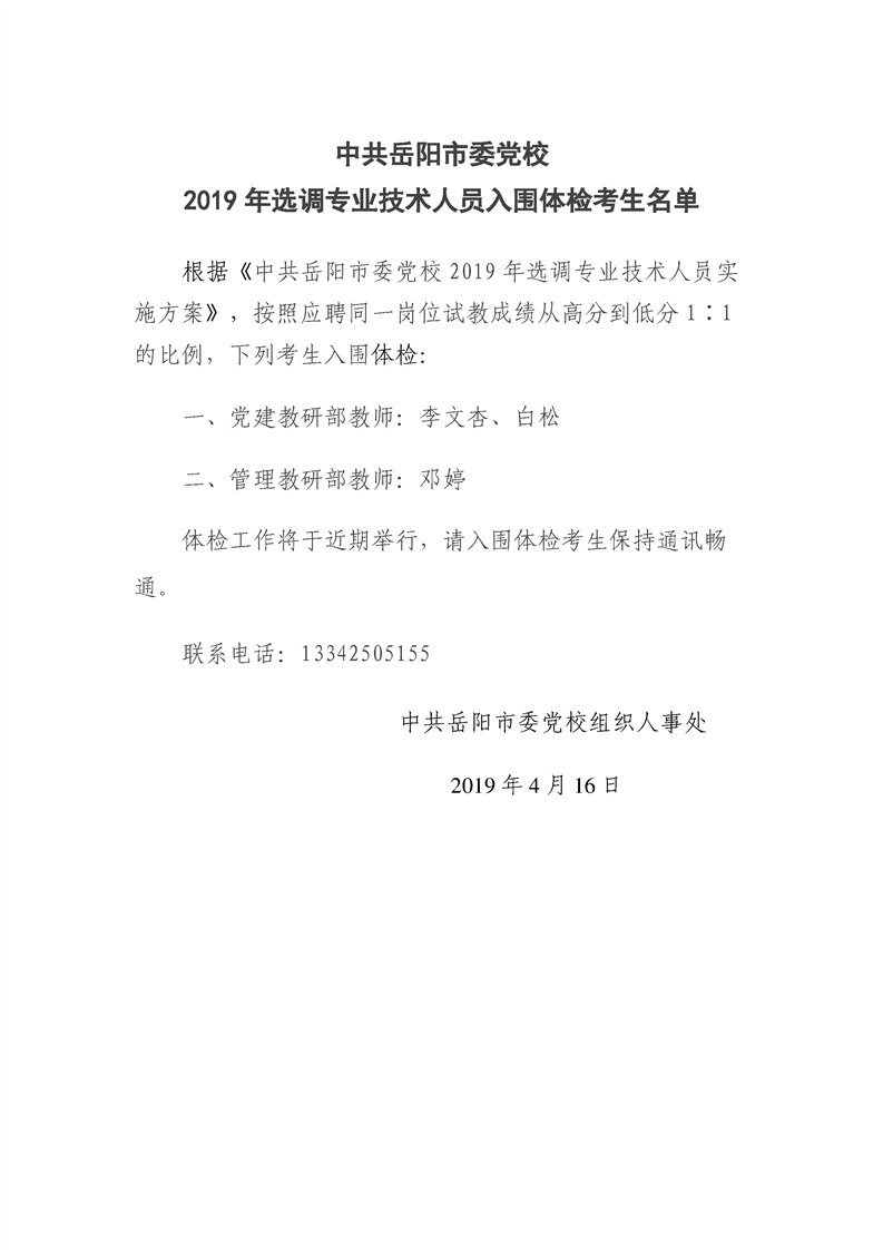 中共岳阳市委党校2019年选调专业技术人员入围体检考生名单