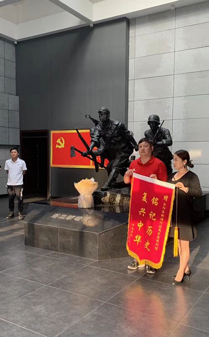 在“浴血新墙河”的雕塑前,全体学员庄严肃立,凝神敬仰,向革命先烈们敬献鲜花,班长郑景代表全班向纪念馆赠送了“铭记历史,复兴中华”的锦旗。